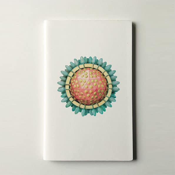 Notizheft „enjoy the little things“ mit einer medizinischer Illustration eines Viruses von Isabel Christensen.